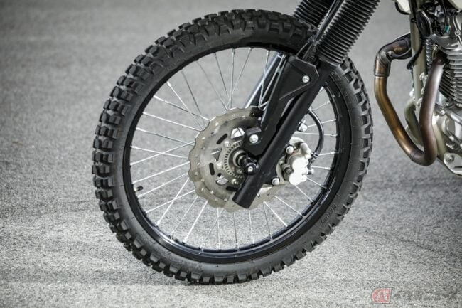 最低地上高240mmで、もちろんシェルパ同様にオフロード専用モデルKLX230Rと同様の軽量なアルミスイングアームを採用しています。モトクロッサーKXイメージのブラックアルマイトリムもスポーティとしか言いようがありません。