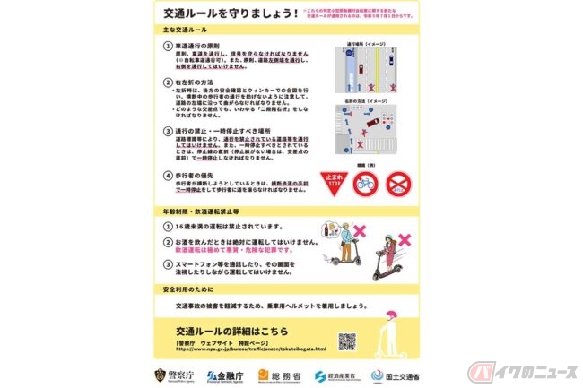 走行は車道通行、「ながら運転」や「飲酒運転」禁止など交通ルールの遵守は言うまでもありません。特に「飲んだら乗らない」といった基本ルールはクルマやバイクと同様です。