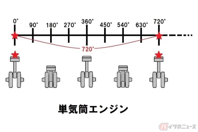 そしてクランク1回転を360°と考えると2回転だと720°なので、4ストローク単気筒エンジンは「720°の等間隔爆発」になり、これがすべての4ストロークエンジンの爆発間隔の基本形になります。