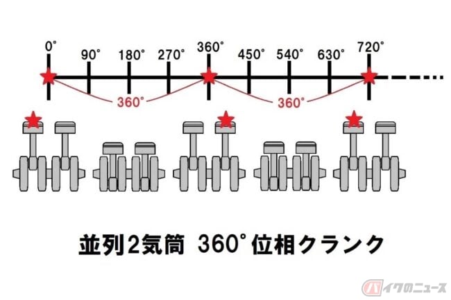 ひとつのシリンダーは単気筒エンジンと同様に、クランク2回転で1回(=720°毎に1回)爆発します。そして隣のシリンダーはクランク1回転分ズレてから爆発するので、結果として「360°の等間隔爆発」になります。クランク1回転分ズレているので「360°位相クランク」と呼ぶワケです。
