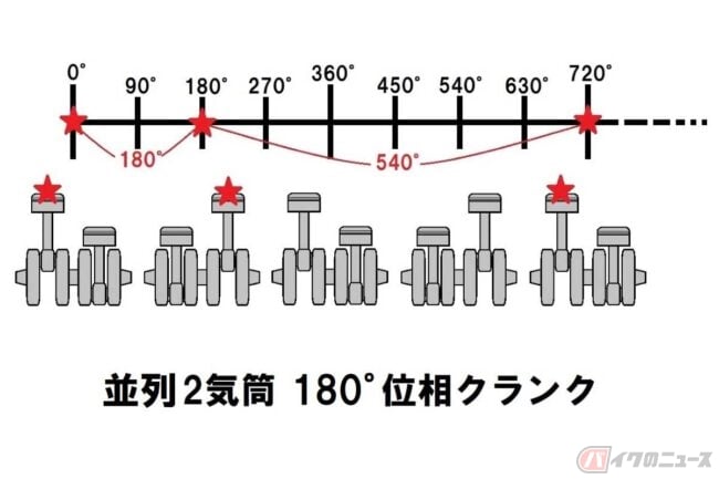 それぞれのシリンダーは720°に1回爆発するわけですが、クランクのズレ(位相)が180°なので、爆発間隔は「180°-540°」を繰り返す「不等間隔爆発」になります。