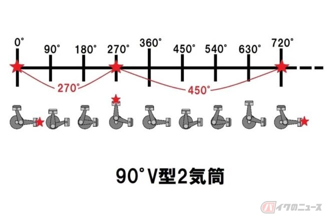 クランクのズレが270°なので、爆発間隔は「270°-450°」を繰り返す「不等間隔爆発」になります。じつはトトトト……と連続的な等間隔爆発よりも、トト・トト・トト……というリズムの不等間隔爆発のパルスの方が、後輪が路面を捉える力を高めることができます。これはグリップ力のみならず、旋回力(専門的にはトラクション)を高めるのにも役立ちます。
