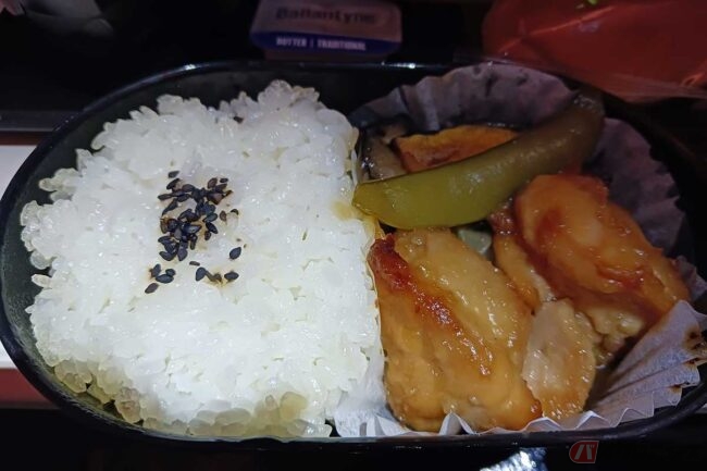 メインは揚げたチキンにあんがかかっているものでした。それを見て唐突に思い出したのですが、わたしは出発前、空港のラウンジで唐揚げ丼(ミニ)を食べていたのです。