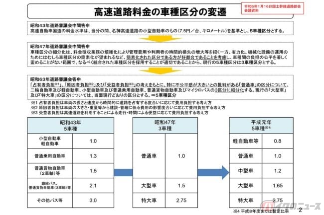 約30年前にNEXCO系高速道路で5車種区分となった最も大きな理由が、バイク独自の「占有者」負担の考え方でした。高速道路の利用で1台の車両が占める面積と実勢速度の平均値に基づいて負担率を算出するのですが、バイクには四輪車には無い“上げ底”的なデータが用いられていたのです。