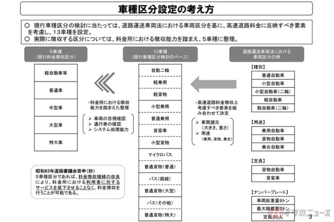 従来の高速道路料金は、「占有者」、「原因者」、「受益者」の負担の考え方で、「車種間の不公平感を踏まえて車種区分を細分化」している、と高速道路課は話します。