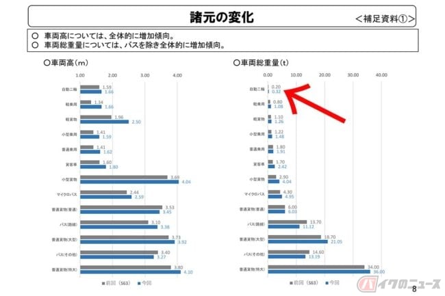 車両の諸元は、通行料金の算出結果に大きな影響を与えていますが、高速道路課が資料で示すバイクの諸元は、当時と大きく変わっています。「バイクが成長している」のです。