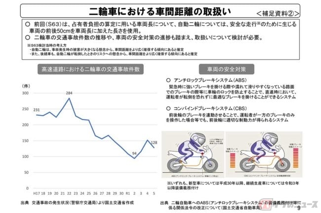 高速道路課は二輪車の安全対策が進んだから、見えない「車間距離」は、今回の議論から除外すると説明します。安全対策とは、2018年に義務化されたバイクのABSの搭載についてです。
