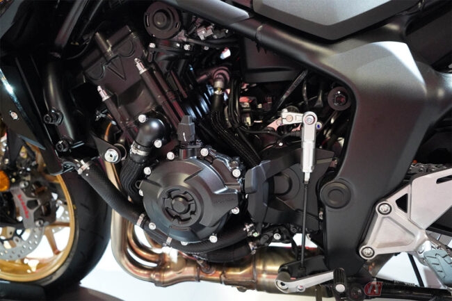 CB1000 HORNETはスチール製ツインスパーフレームに、2017年型のスーパースポーツモデル「CBR1000RR」のエンジンをベースに専用セッティングを施した999cm3 水冷4ストロークDOHC4バルブ直列4気筒エンジンが搭載されています。