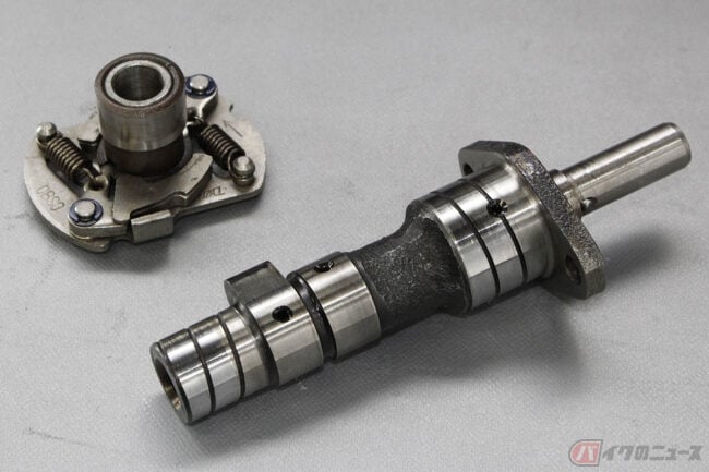 4ストロークエンジンの場合は、圧縮比と点火時期とカムプロフィールでエンジン特性は変わります。特に、エンジン性能に大きな違いをもたらすカムシャフトは、目視比較だけでは、その違いを理解しにくい部品です。しかし、2本のカムシャフトを真横から同時に目視すると、カム山の盛り上がり方に違いがありました。
