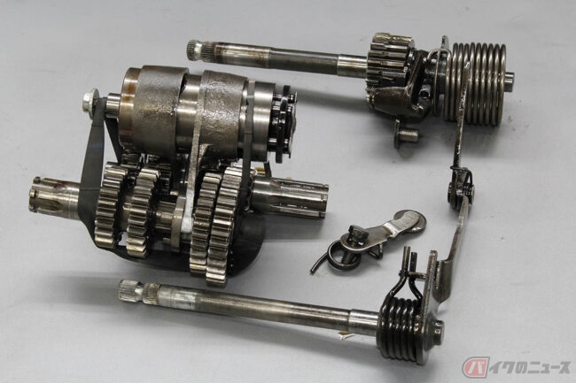 トップギヤで走行中および、リヤタイヤが回転しているとき(遅くても)には、トップからニュートラルへギヤがシフトできない構造になっていました。具体的には、ミッション軸が回転しているときの遠心力で、ストッパーブレートがシフトドラムのシフトフォーク溝に飛び込み、トップギヤからニュートラルへのシフトを「機械的にできなく」していました。