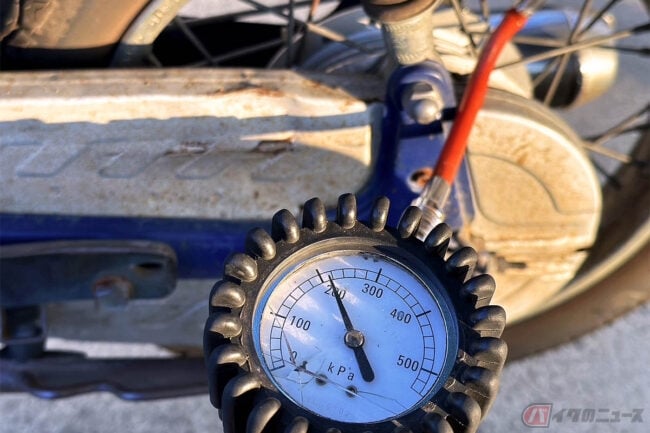 次にタイヤの空気圧も確認すべき項目のひとつです。タイヤの空気は長期間の保管により、自然に抜けてしまうことがあります。