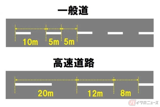 3秒先が何メートルかわかったら、実際にその距離の目安にすると便利なのがセンターラインや車線を区切る白線(破線)です。この白線の長さと間隔は、一般道と高速道路で異なります。