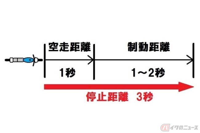 「遠くを見る」のは、前方に発生した危険の回避、すなわち前方の危険個所までに停止することが基本的な目的です。そしてバイクやクルマは前方に危険や異常を察知してから停止するまでに、おおむね3秒かかります。