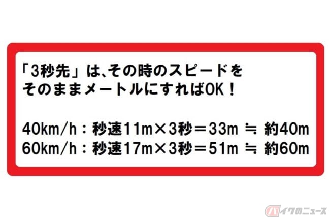 それでは、「3秒先」とは具体的に何メートルになるのでしょうか? 当然ながらスピードが低ければ距離が短く、高ければ距離が長くなります。計算すれば分かるとはいえ、走行中にその都度計算するのは現実的ではありません。その間にドンドン進んでしまいます。