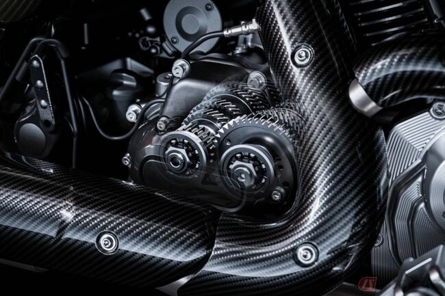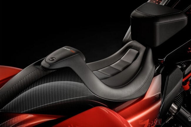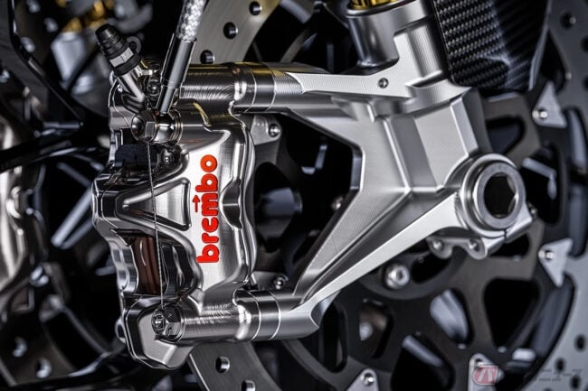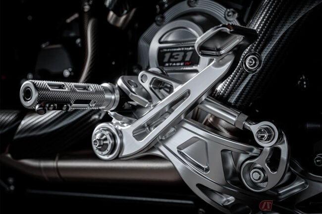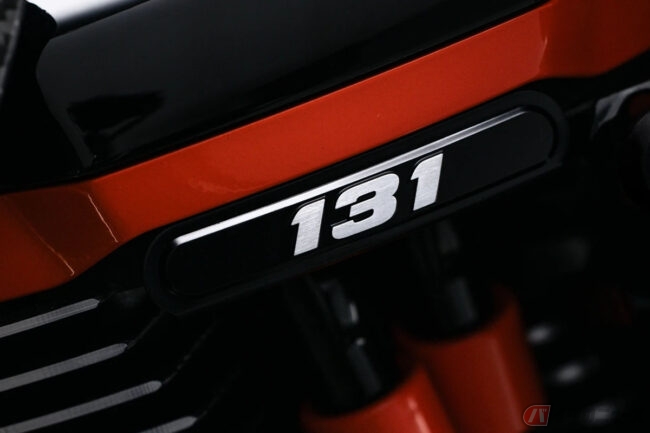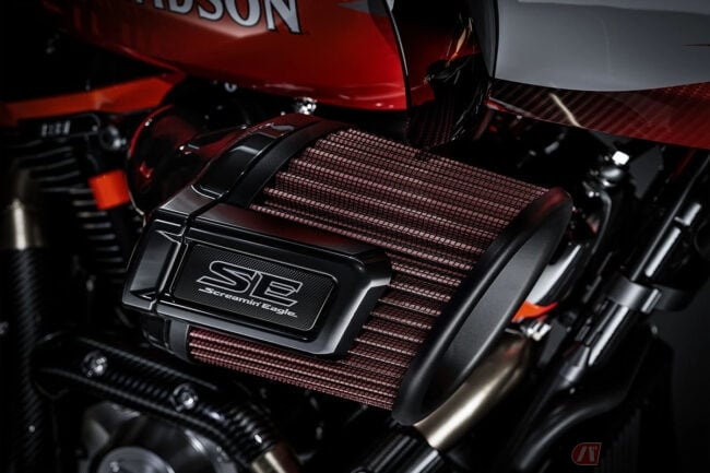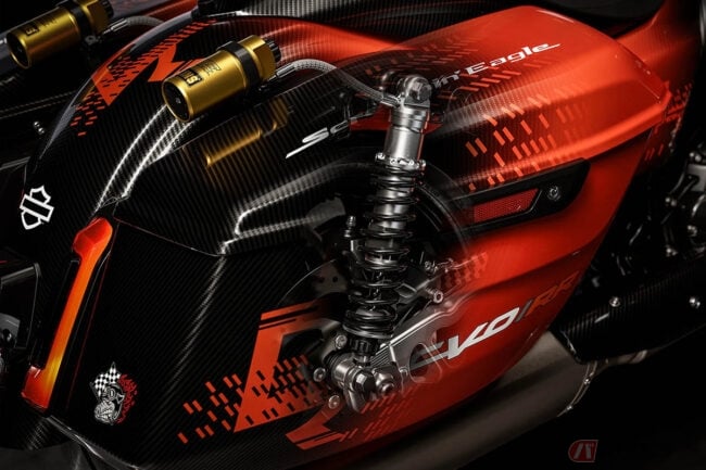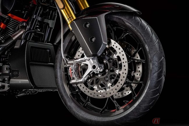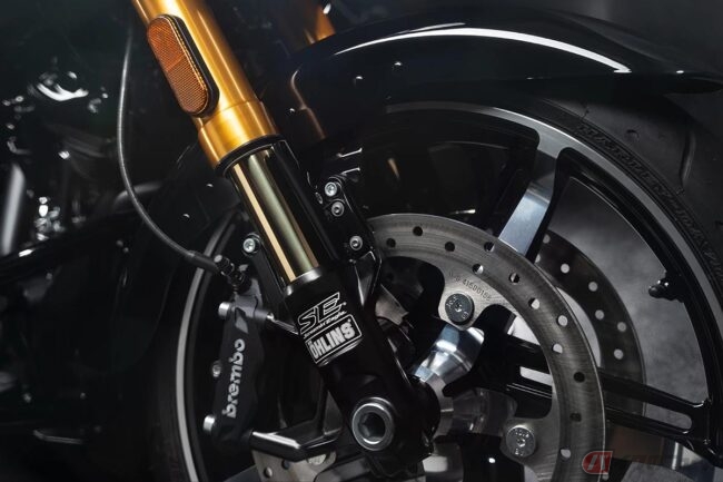 オーリンズ製FGR倒立フォークやリモートリザーバーリアショック、ブレンボ製GP4-RX CNCキャリパー、T-DRIVEローター、鍛造アルミホイールなどレース用バイクでも用いられる高性能パーツを備えながらも、カスタムバイクのような鮮やかで室の高いペイントを施すことでハーレーダビッドソンの車両らしい、威風堂々とした雰囲気に仕上げられています。