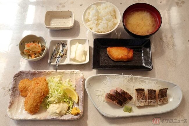 そして筆者が頼んだ「漁師定食」も出来上がってきました。アジフライに刺身、焼き魚とボリュームたっぷりです。