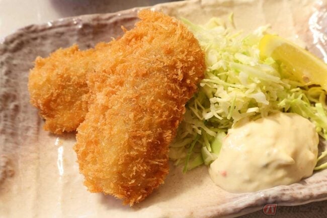まずはアジフライからいただきます。揚げ色は薄め、サクサク食感の揚げ具合で、シーズン的、場所的に身が締まったアジかと思いきや、ふわっとしてます。なかなか良い感じです。