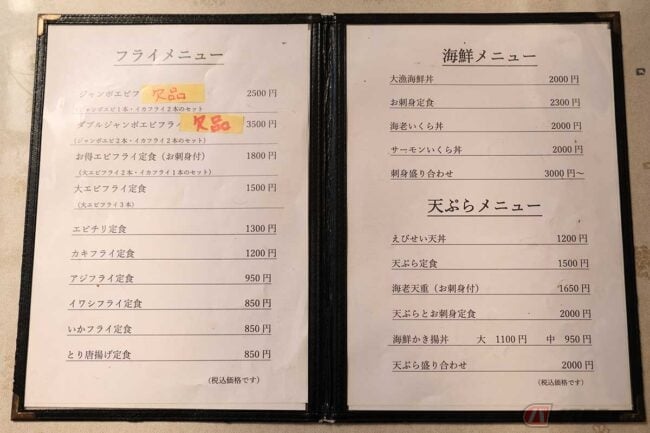 メニューを見ると、やはりエビを使った料理が多いですが、イワシフライとエビフライのセットもあります。そしてアジフライもあるではないですか! 店の女性スタッフに訊いてみると、アジもエビに負けず人気があるそうです。