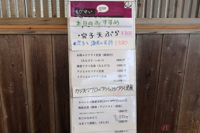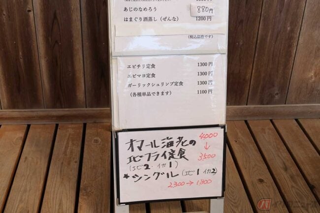 どれにするか久しぶりに悩む筆者です。しかーし! 取材が控えているので悩んでいる暇はありません。アジ&エビにも心が揺れますが、刺身も食べたいので「漁師定食」に決定! エビエビ言っていたI編集長も「オマールエビがー!」などと悩んでいます。立て看板のメニューを見ると、一番下に「オマール海老のエビフライ定食」が! さすがに仕事前に食べるものではない(意味不明)と、オーダーしたのは「海感」の薄い「エビチリ定食」でした。