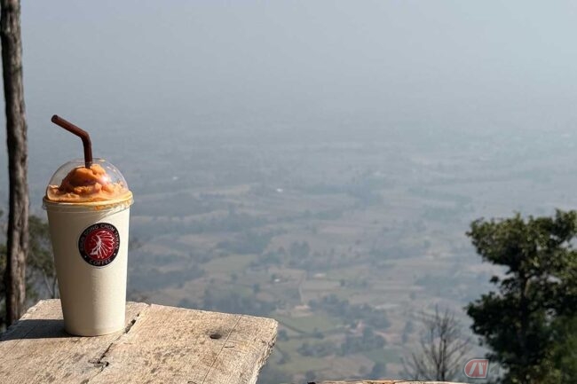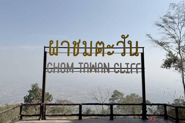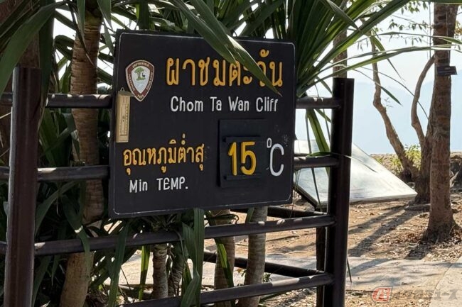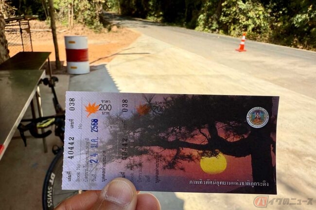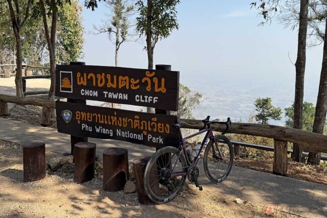 サイクリストにとっての目玉は、ヒルクライムスポット「チョム・タワンの崖」です。隆起によって生まれた、盆地を取り囲む山脈の急峻な崖を駆け登り、崖の淵に立って絶景を堪能できます。入口のゲートで200バーツ(約900円)の入園料を支払い、いざスタート!