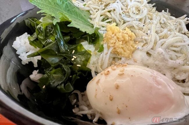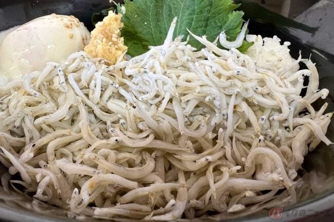 出来上がってきた丼には、たっぷりのしらすに半熟玉子、大葉、生姜などが盛られ、炒りごまも少し振りかけてあります。小皿に入れられた醤油をかけ、少しずつ混ぜながら食べてみると……なんとも言えない旨みが口の中に広がっていきます。