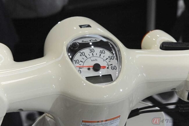 コンセプトモデルには、スーパーカブのエンブレムの下に「Lite」のロゴが入ります。「スーパーカブ110」のエンジンの出力を規制内に落としても、市販モデルではなお混合交通での走りやすさを備えた走行性能が得られる予定です。