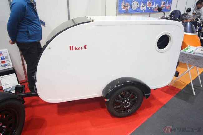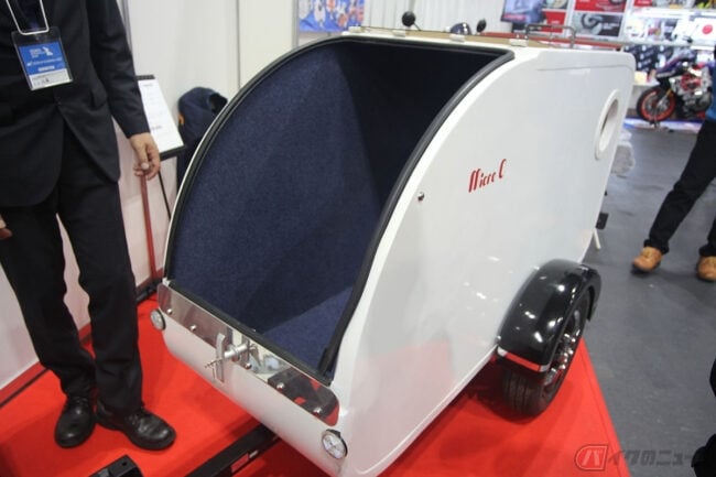 また、「マイクロC」と名付けられたトレーラーは同社が製作するサイドカーでも使用されるもので、丸みのある可愛らしいルックスながら、長さ1800mm、高さ900mm、幅600mmと大容量(1立方メートル)で約35kg程度と軽量。