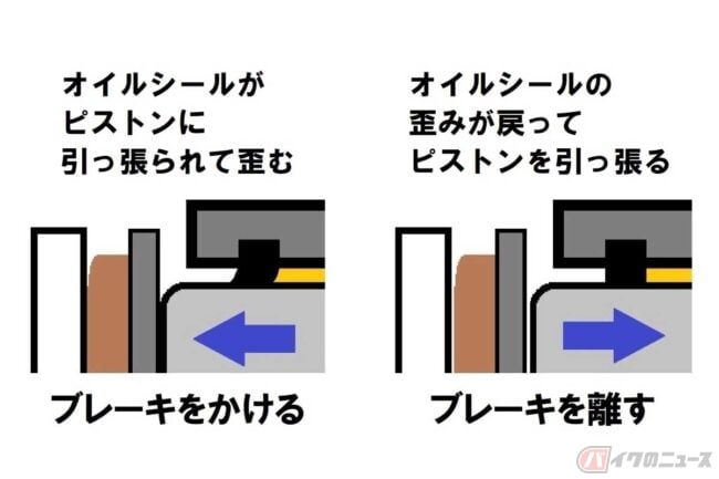 ブレーキをかけてピストンが押し出される際に、オイルシールが引っ張られて歪みます。そしてブレーキを離すと、オイルシールの歪みが元に戻ろうとしてピストンを引き戻します。