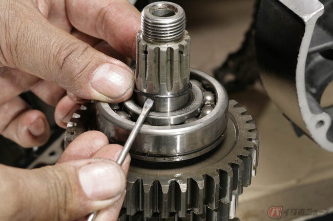 メインシャフトにクラッチユニットが組み込まれた状態のままでも、分解組み立てには支障ありません。比較的最近にメンテナンス履歴がある箇所で、分解しなくても済むような場合は、敢えて分解の必要性が無いことも、心にとめておくと良いです。