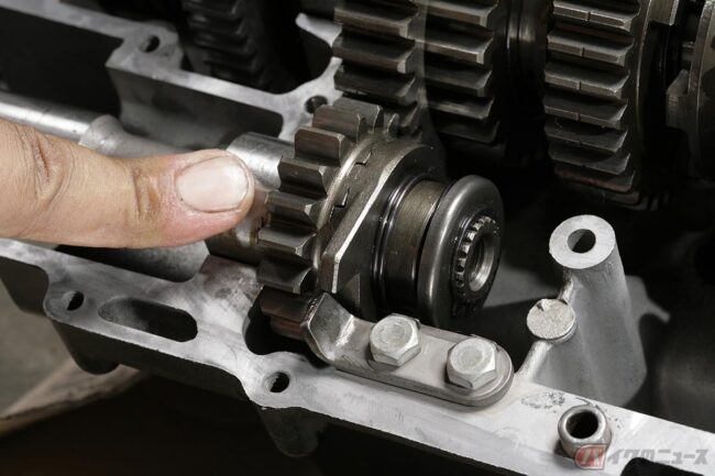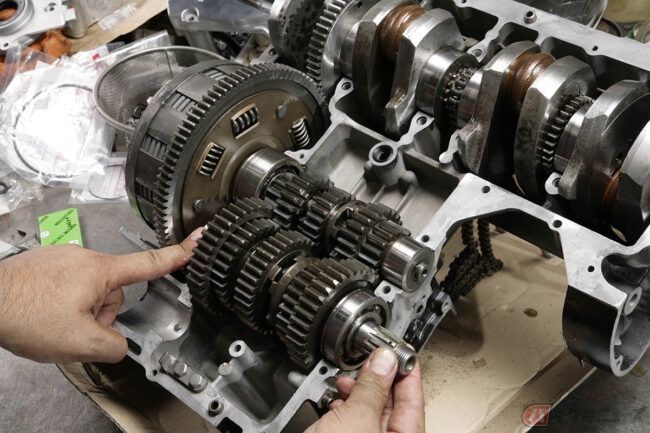 それでも今回は、分解したミッションシャフトのメインシャフト側、アウトプットシャフト側、いずれもギヤ一枚一枚を丁寧に点検し、歯のあたり具合やギヤチェンジドグの摩耗など、しっかり点検しました。