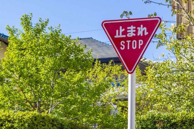 赤い逆三角形に白い文字で「止まれ」と書かれている一時停止の標識がある場所では、地面に引かれた白い停止線の手前で必ず一度止まらなければいけません。