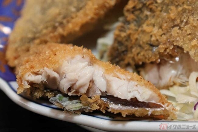まずはアジフライからいただきます。薄めの衣はサクッとした食感で絶妙な揚げ具合です。身は柔らかめ、シーズンインということもあって脂が乗っていてウマい!