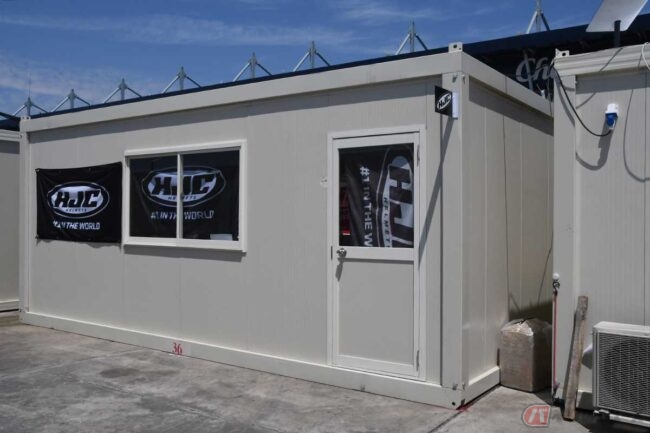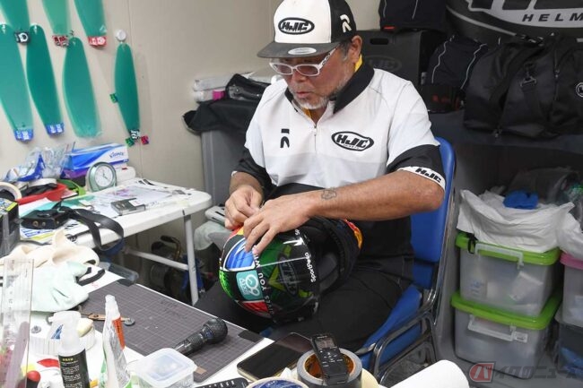 あと、細かいことですけど、基本的にこういうブース(※タイGPはフライアウェイのため、トラックではなくコンテナタイプのオフィスだった)の時は、ドアを開けっぱなしにしています。タイは湿気がないからいいのですが、湿気の多いマレーシアなどでは冷えた部屋からヘルメットを表に出すと、気温差と湿度でシールドに湿気がついてしまうんです。だからドアを開けて、エアコンがあっても暑くなってしまう部屋で作業しています。それはヘルメット、シールドを大切に守りたいからです。そのために万全を期しています。