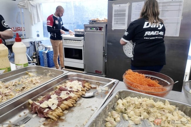 日本とは違い、レースウィーク中はサーキットから出ない人も多いんだそうです。そのため、食事はパドックにある「ホスピタリティ・テント(以下、ホスピ)」という場所でします。