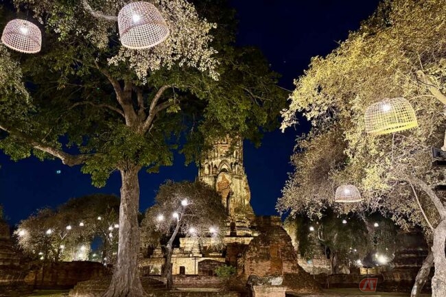 陽が傾く頃には、遺跡群が夕日を背に、再び輝き始めます。夕暮れに染まるアユタヤの遺跡は、また違った美しさを見せてくれます。そして夜になるとライトアップされた遺跡が幻想的な雰囲気を醸し出し、昼間とは異なる魅力が広がります。夜のサイクリングにはライトが必須ですが、夜風を感じながらゆったりと遺跡を巡るのも、アユタヤならではの楽しみ方です。