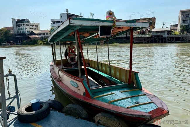 アユタヤ駅を降りたら、市街地への移動には渡船がオススメ。船には自転車を載せられるので、遠回りして交通量の多い橋を渡らずに、ショートカットが可能です。波に揺られる時間もまた、旅情を高めてくれるはずです。