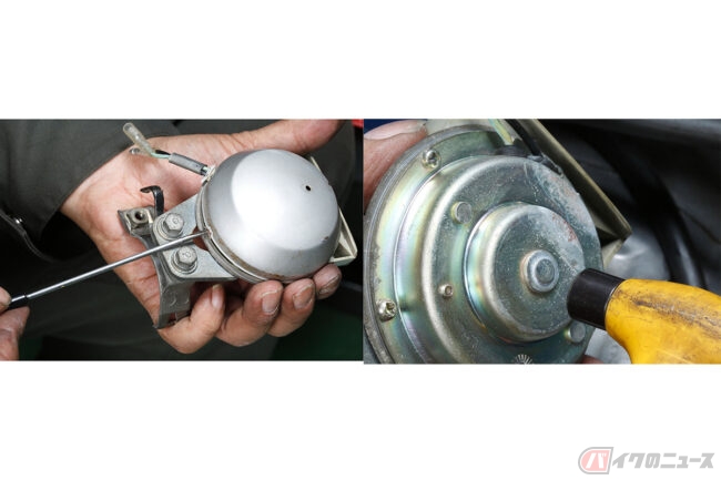 現代的バッテリーレス車に装備される電子ホーンは、壊れてしまうと修理が難しいですが、メカニカルな旧式ホーンは、調整によって音質が復活するケースがあります。
