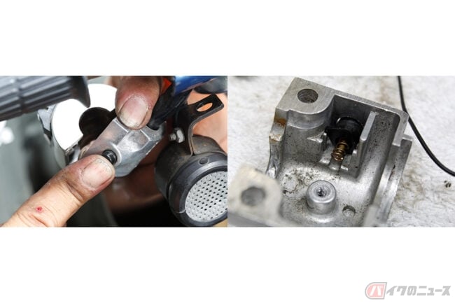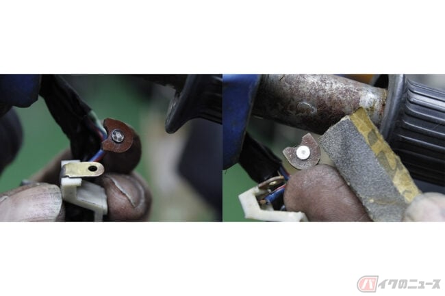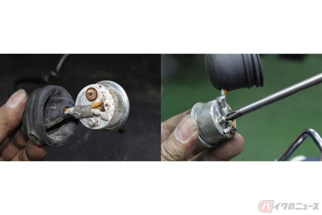 スーパーカブC90K2には、左側ハンドルスイッチの下にウインカーブザーが装備されています。このブザーも響きが悪かったので、ダンパーゴムをめくったところ、溜まった雨水でサビサビ状態でした。ホーンと同じようにクリーニングしてから、アジャストボルトを調整したら、やかましいほどのピーピー音に復活しました。ぜひ愛車のメンテナンス時に参考にしてみてください。