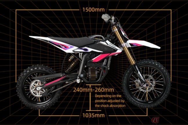 同ブランド初となるキッズ(ユース)モデル「ハイパー・ビー」は、フロント14インチ、リア12インチのホイール(標準サイズ)を装備した状態で全長1500mmとなる、サーロン独自の最新技術が搭載されたオフロードタイプの電動バイクです。
