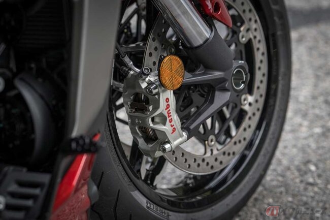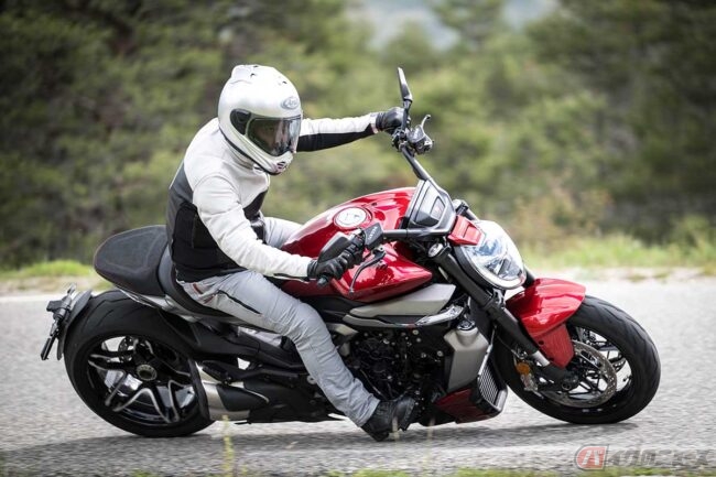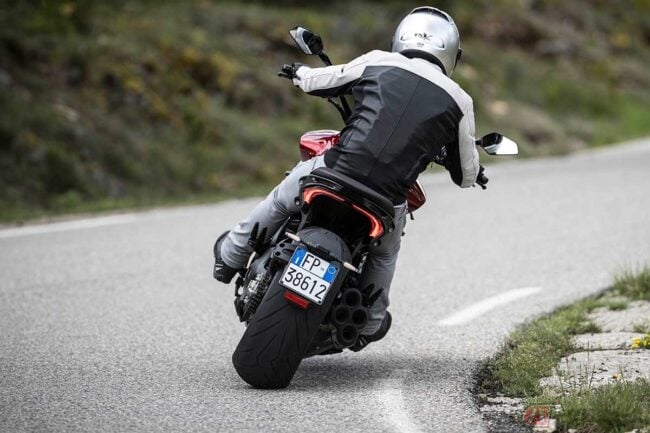 これは前モデルよりもリアサスペンションのストロークを35mm伸ばしたことが効いています。さらにクルーザーでスポーツ走行をするとバンク角不足に悩むことが多々ありますが、「XディアベルV4」にその悩みは皆無。こうした海外試乗会のアベレージは比較的高いのですが、車体はどこも擦ることがありませんでした。