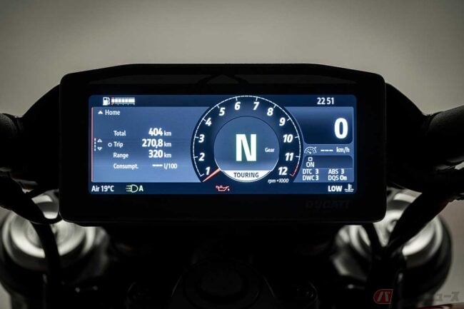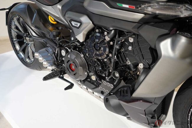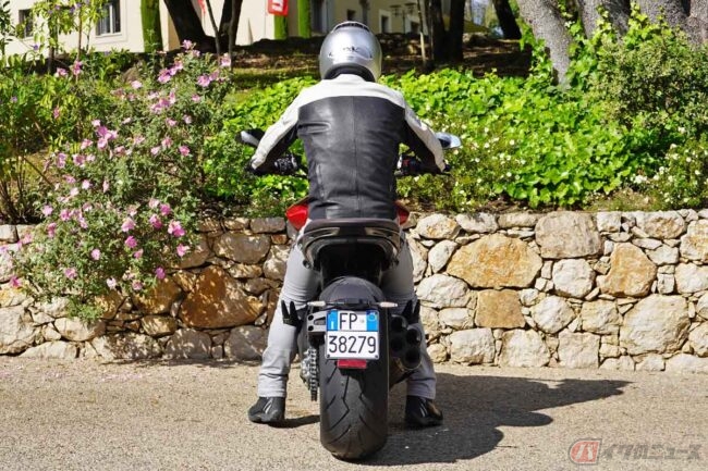 スマートキーをジャケットのポケットに入れ、タンクセンターにある電源ボタンを押すとメーターがオンになります。セルを押すとV4エンジンが目覚め、4つの排気口を持つサイレンサーからジェントルなV4サウンドが轟きます。