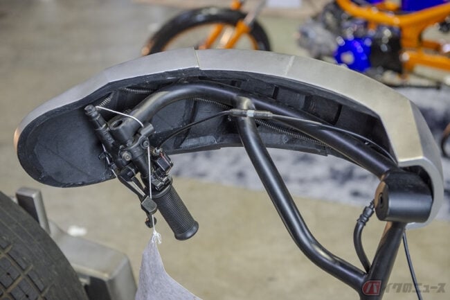 ただ見た目だけでなく実際に走るためのギミックも詰まっており、ハンドル操作は前後に押し引きする形で前輪を左右に振れるようにし、スロットルはATVのレバー式を採用。指先だけでアクセルのオン/オフを可能にしています。