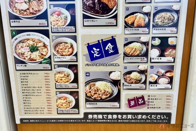 ちなみに、2024年末に訪れたときは「メガ焼肉定食」というメニュー名で1290円で販売されていました。「ジャンボメンチカツ定食」もその時は790円でしたが、現在の券売機を見ると800円となっており、やはり値上がりの波はPAのフードコートにもヒタヒタと押し寄せているようです。