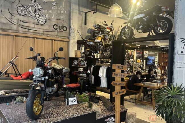 カブハウスは日本のホンダディーラー体制とは違い、125cc以下のギア付き車、いわゆる「原付二種」を扱う店舗であり、店内には日本のGcraft・武川・キタコなど日本のメーカーを中心に、ちょっとした量販店のようなパーツも取り揃えています。