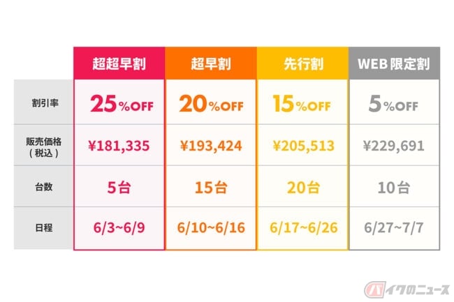 CUX Liteの価格(消費税10%込)は24万1780円でカラーはナイトブラック、アーバンブルー、アイスホワイト、モードグレーの4色。数量限定・早割キャンペーンの適用で最安値18万1335円で購入可能です。