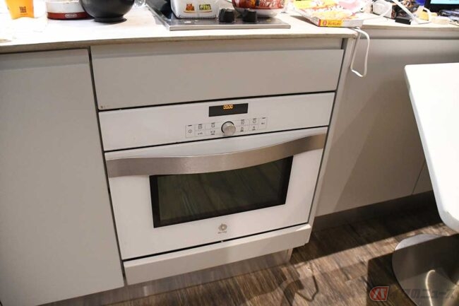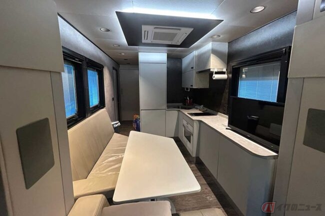 会社によってトラックのレイアウトは違うのですが、HJCの場合は(作業場とミーティングルームで)仕切りをつけました。生活エリアには電動昇降式のセミダブルベッド、ミーティング用のソファとテーブル、備え付けのテレビが2台あります。キッチンには電気式のコンロ、電子レンジや冷蔵庫、冷凍庫も備わっていますし、トイレとシャワーもあります。