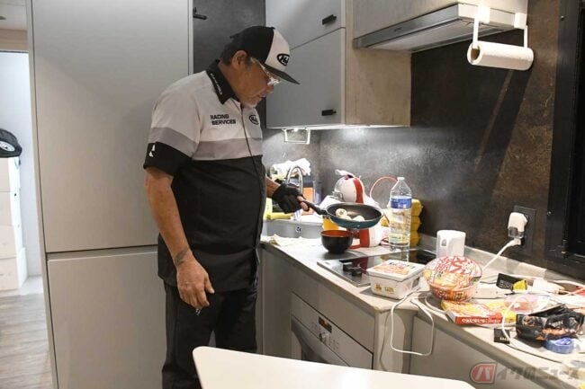 以降は、日曜日まで1日24時間のうち23時間をこのトラックで過ごします。食事の話をすると、僕はカップラーメンをよく食べるのですが、スープヌードルの場合、1~2分でも置いておくと麺が伸びてしまって嫌なので、なるべく焼きそばやカレーなどを自分で作って食べています。もちろん、HJCがサポートしているライダーのチームのホスピタリティに行けば食べられるんですけど、日中はライダーが走っていていつ何があるかわかりませんから、お招きいただいたとしても夜にしか行けません……。