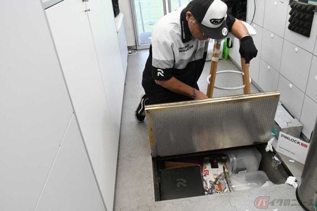 「トレーラーが望ましい」ということになったので、僕は当時、別のヘルメットメーカーでレーシングサービスを担当していたのですが、その会社ではフルサイズのトレーラーを用意し、作業場、キッチン、休むところをそのトレーラーの中で完結できるようにしました。