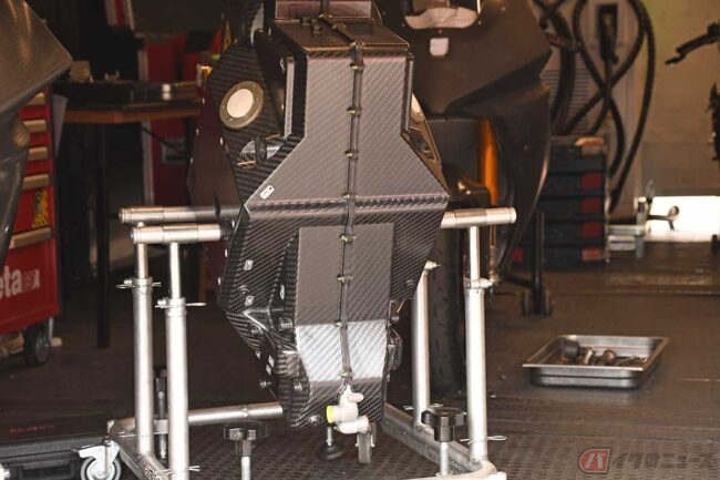 「と言うのも、バッテリーパックの外装はカーボンファイバー製で、ねじれ方向や横方向の剛性を持たせる設計になっているんです。そのため、ライダーに同じフィーリングを提供するためにも形状は変えないことにしました。最終的に、ライダーたちは『このバイクは良い』と感じてくれていました。まだ少し重いですが、良いバイクだ、とね。ですから、バッテリーパックの内側の部分だけに手を加えて、内部から重量を減らすように努めたのです」