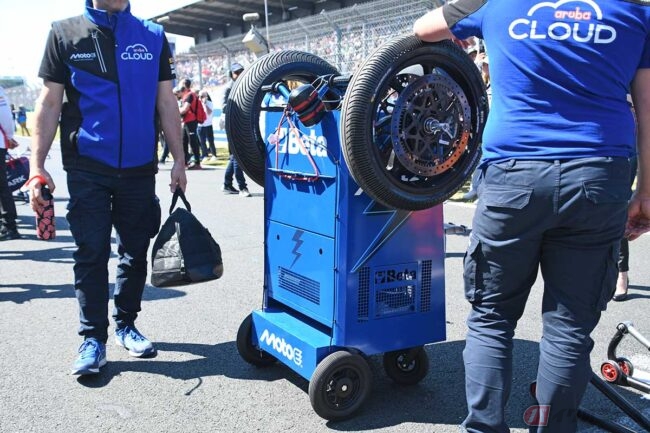 EnelはMotoE初年度からタイトルスポンサーであっただけではなく、MotoEのための充電器を開発し、供給していました。この充電器はバッテリーを内蔵し、MotoEマシンはパドックと、ポータブル充電器によってグリッド上でも充電することができていたのです(2024年までは、コースインをしてグリッドにつくまでに消費した1周分の電力を、グリッド上で再充電していました)。